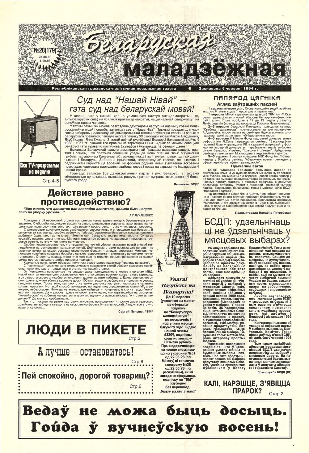 «Беларуская маладзёжная» (1994 - 2002) — беларуская газэта, дадатак да аднайменнай радыёстанцыі. Зарэгістраваная ў сакавіку 1994 году. У ёй друкаваліся расшыфроўкі радыйных гутарак, анонсы этэраў і ўсё, што не зьмяшчалася ў радыёфармат. Калі радыёстанцыю зачынілі, газэта засталася. Галоўны рэдактар — Тацьцяна Мельнічук. Традыцыйны фармат — 8 старонак А3. Газэта асьвятляла нараджэньне й разьвіцьцё палітычнай апазыцыі сярэдзіны-канца 1990-х, дзейнасьць незарэгістраваных моладзевых аб'яднаньняў з усіх бакоў палітычнага сьпектру, сачыла за разьвіцьцём й актуальным станам альтэрнатыўнай моладзевай культуры Беларусі. З 1995 па 1998 рэдакцыя газэты праводзіла у Менску вулічны рок-фэст «Купальле з Беларускай маладзёжнай». Апошні нумар выйшаў у чэрвені 2002 году. У кастрычніку 2003 году пасьведчаньне аб рэгістрацыі было скасаванае міністэрствам інфармацыі РБ. Крыница: be-tarask.wikipedia.org