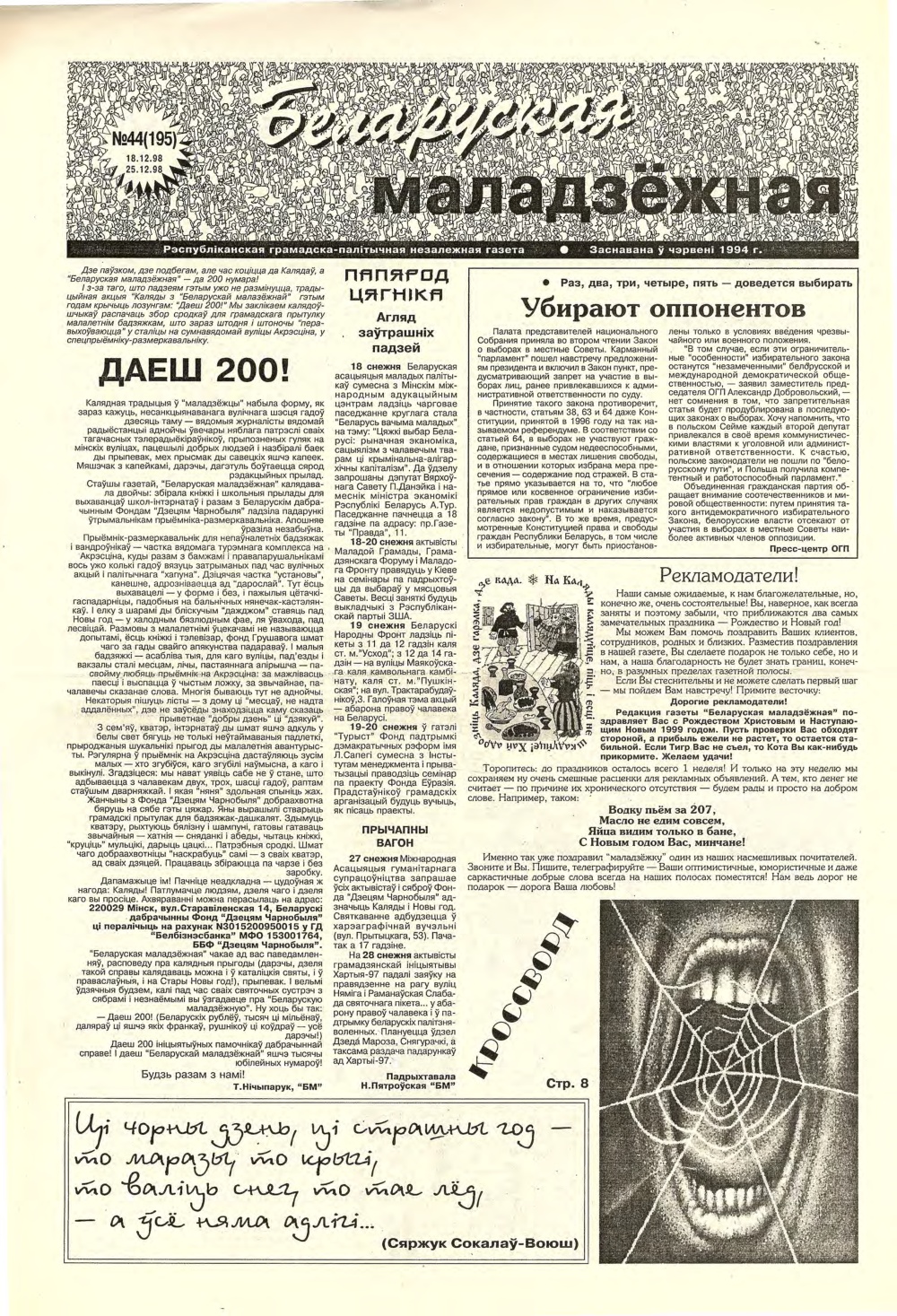 «Беларуская маладзёжная» (1994 - 2002) — беларуская газэта, дадатак да аднайменнай радыёстанцыі. Зарэгістраваная ў сакавіку 1994 году. У ёй друкаваліся расшыфроўкі радыйных гутарак, анонсы этэраў і ўсё, што не зьмяшчалася ў радыёфармат. Калі радыёстанцыю зачынілі, газэта засталася. Галоўны рэдактар — Тацьцяна Мельнічук. Традыцыйны фармат — 8 старонак А3. Газэта асьвятляла нараджэньне й разьвіцьцё палітычнай апазыцыі сярэдзіны-канца 1990-х, дзейнасьць незарэгістраваных моладзевых аб'яднаньняў з усіх бакоў палітычнага сьпектру, сачыла за разьвіцьцём й актуальным станам альтэрнатыўнай моладзевай культуры Беларусі. З 1995 па 1998 рэдакцыя газэты праводзіла у Менску вулічны рок-фэст «Купальле з Беларускай маладзёжнай». Апошні нумар выйшаў у чэрвені 2002 году. У кастрычніку 2003 году пасьведчаньне аб рэгістрацыі было скасаванае міністэрствам інфармацыі РБ. Крыница: be-tarask.wikipedia.org