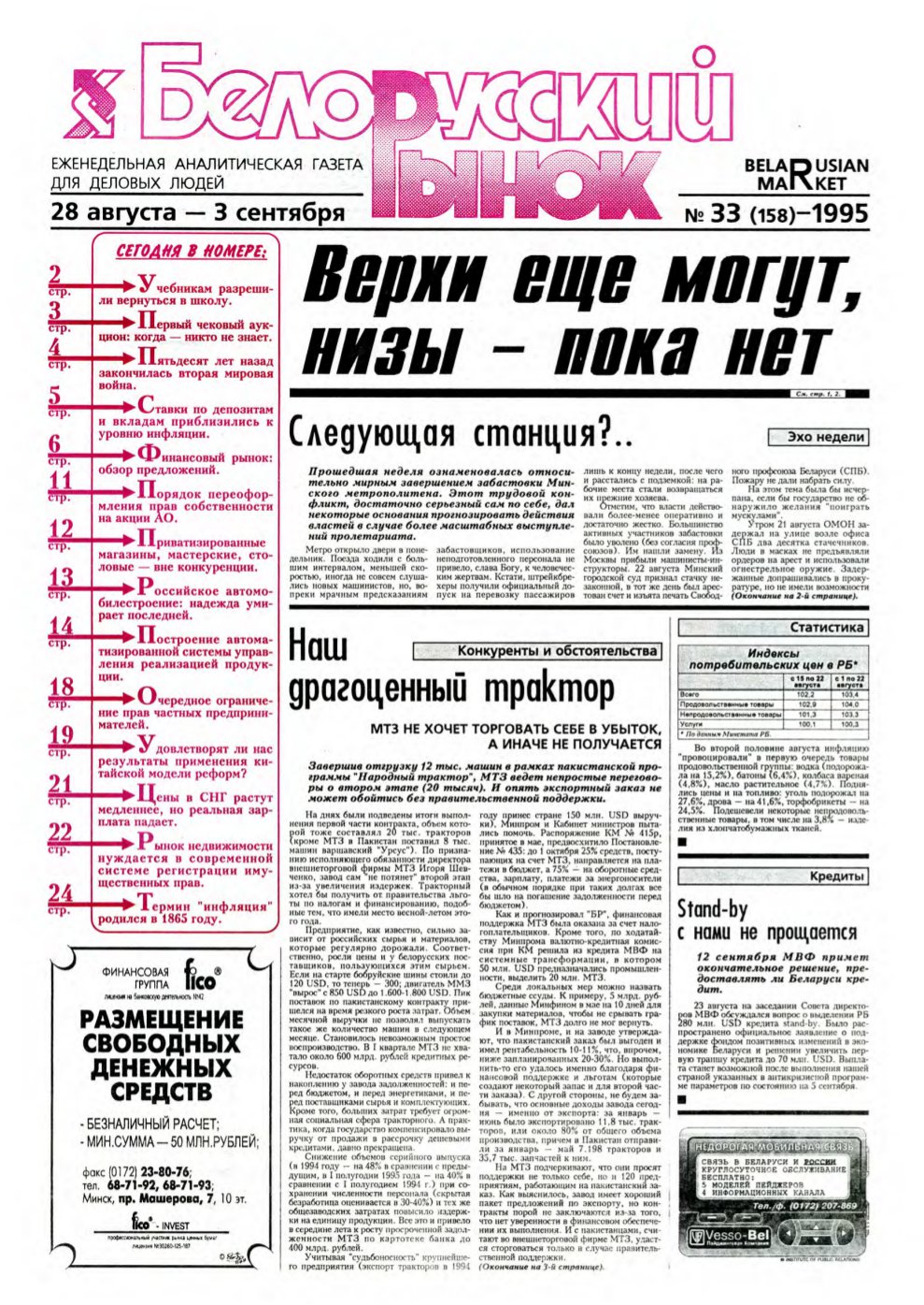 «Белорусский рынок» — независимая индексная газета для деловых людей. Учредитель — МП «Белорусский рынок». Издается при содействии РИА “Новости”. Выходит раз в две недели. Ответственность за точность тгриве-^ денных фактов, цитат, цифр, собственных имен, географических названии и прочихсведенйй^а также за разглашение закрытой информации несут авторы. Редакция может публиковать статьи в порядке обсуждения, не разделяя точку зрения автора.