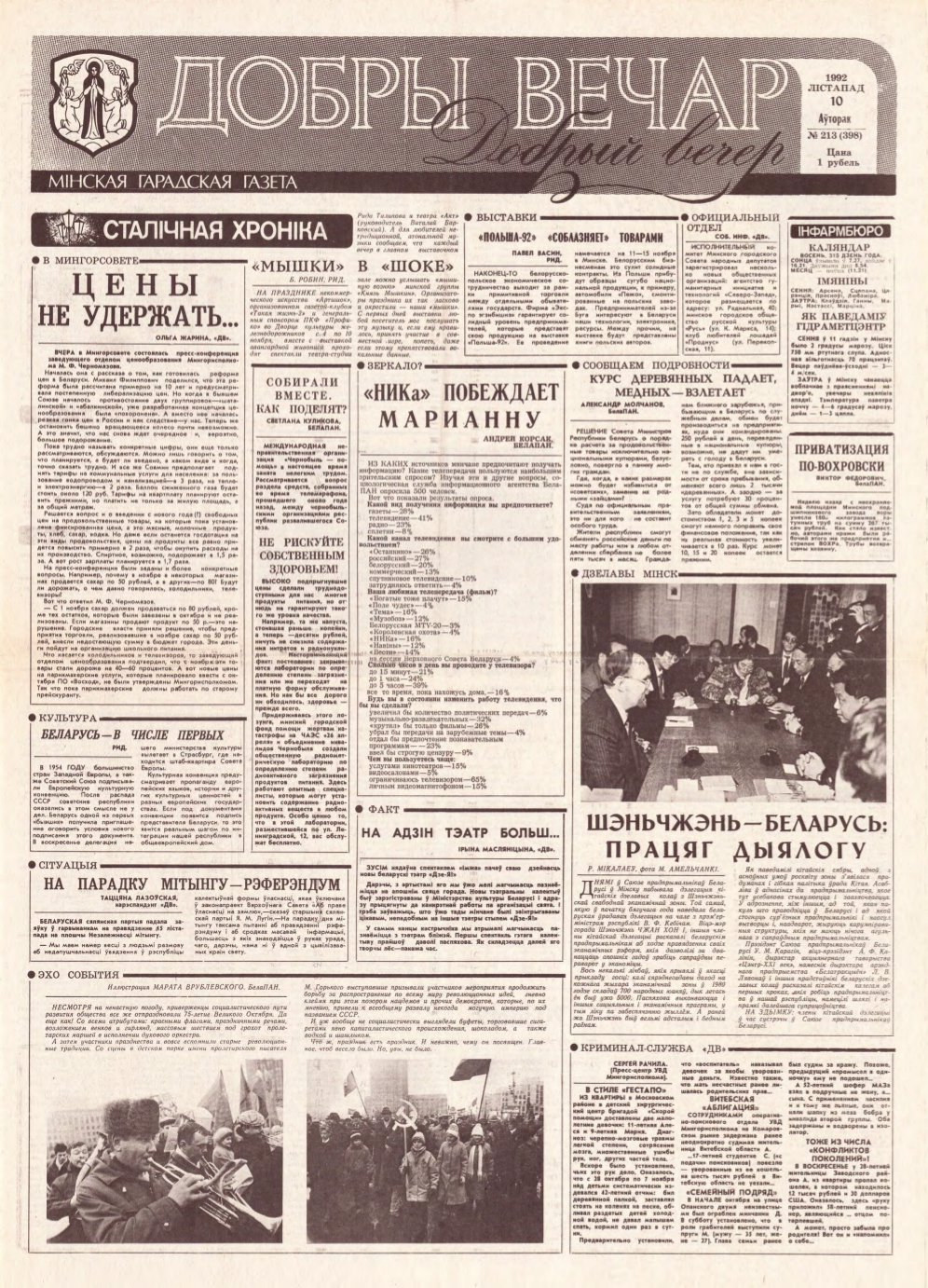 «Добры вечар» — мінская гарадская газета. Выдаеццап з лістапада 1990. Заснавальнік: Мінскі гарадскі Савет народных дэпутатаў. Аўтары змешчаных матэрыялаў нясуць адказнасць за падбор і дакладнасць прыведзеных фактаў, цытат, эканамічных даных, асабістых імён, геаграфічных назваў і іншай інфармацыі, а таксама за тое, каб у матэрыялах не ўтрымлівалася звестак, якія не падлягаюць адкрытай публікацыі. Допісы, атрыманыя рэдакцыяй, не рэцэнзуюцца і не вяртаюцца.