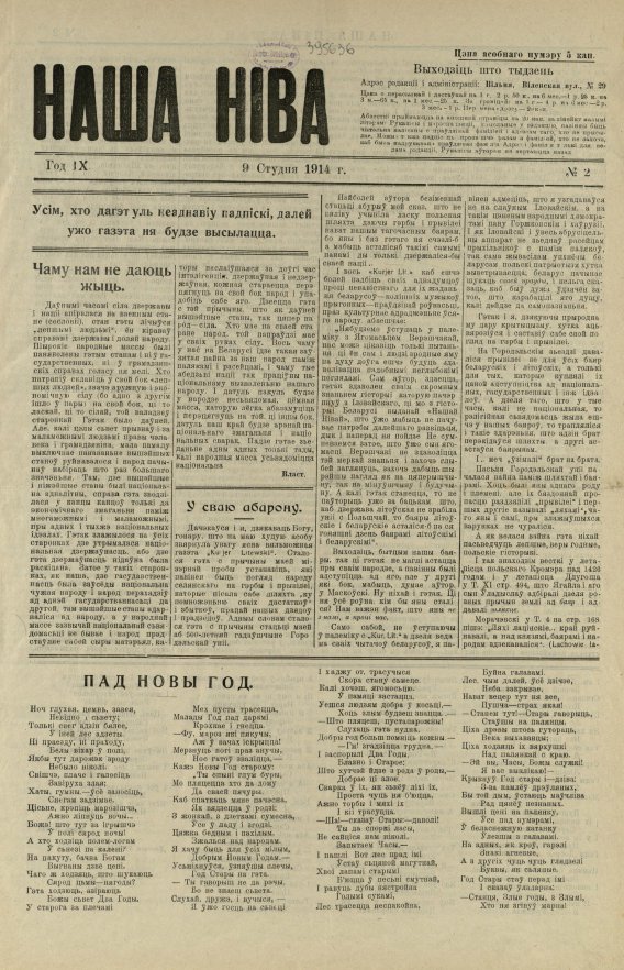 «Наша ніва» (тагач. лац. «Nasza niwa») — штотыднёвая грамадска-палітычная, навукова-асветніцкая і літаратурна-мастацкая газета нацыяльна-адраджэнскага кірунку. Выдавалася ў Вільні, па-беларуску, у перыяд 10 (23).11.1906 — 7 (20).8.1915. Друкавалася кірыліцай, да 18 (31).10.1912 таксама і лацінкай. Звычайны тыраж складаў 4.5 тыс. асобнікаў. Выхад газеты быў спынены ў сувязі з набліжэннем расійска-нямецкага фронту да Вільні. Заснавальнікі — кіруючая група Беларускай сацыялістычнай грамады (Іван Луцкевіч, Антон Луцкевіч, Вацлаў Іваноўскі, Аляксандр Уласаў, Цётка (Алаіза Пашкевіч) і інш.) Тая ж група кіравала газетай і пасля распаду Беларускай сацыялістычнай грамады да сакавіка 1914. Заснаванне газеты было вынікам рашэння віленскай канферэнцыі БСГ (3—4 чэрвеня 1906). А. Луцкевіч пішучы паказанні следчаму НКУС, успамінаў, што непасрэдная ініцыятыва закладання беларускага друку належала яго брату Івану. Крыніца: be.wikipedia.org