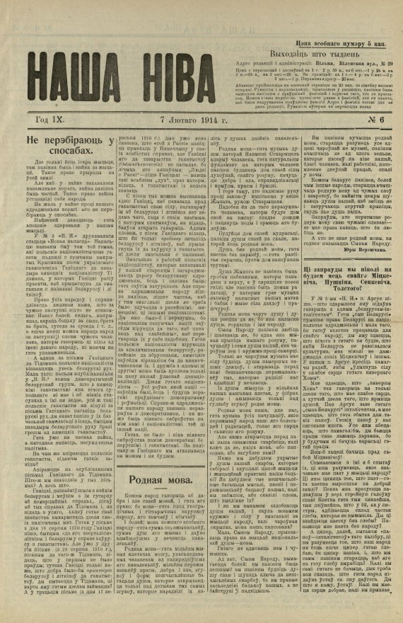 «Наша ніва» (тагач. лац. «Nasza niwa») — штотыднёвая грамадска-палітычная, навукова-асветніцкая і літаратурна-мастацкая газета нацыяльна-адраджэнскага кірунку. Выдавалася ў Вільні, па-беларуску, у перыяд 10 (23).11.1906 — 7 (20).8.1915. Друкавалася кірыліцай, да 18 (31).10.1912 таксама і лацінкай. Звычайны тыраж складаў 4.5 тыс. асобнікаў. Выхад газеты быў спынены ў сувязі з набліжэннем расійска-нямецкага фронту да Вільні. Заснавальнікі — кіруючая група Беларускай сацыялістычнай грамады (Іван Луцкевіч, Антон Луцкевіч, Вацлаў Іваноўскі, Аляксандр Уласаў, Цётка (Алаіза Пашкевіч) і інш.) Тая ж група кіравала газетай і пасля распаду Беларускай сацыялістычнай грамады да сакавіка 1914. Заснаванне газеты было вынікам рашэння віленскай канферэнцыі БСГ (3—4 чэрвеня 1906). А. Луцкевіч пішучы паказанні следчаму НКУС, успамінаў, што непасрэдная ініцыятыва закладання беларускага друку належала яго брату Івану. Крыніца: be.wikipedia.org