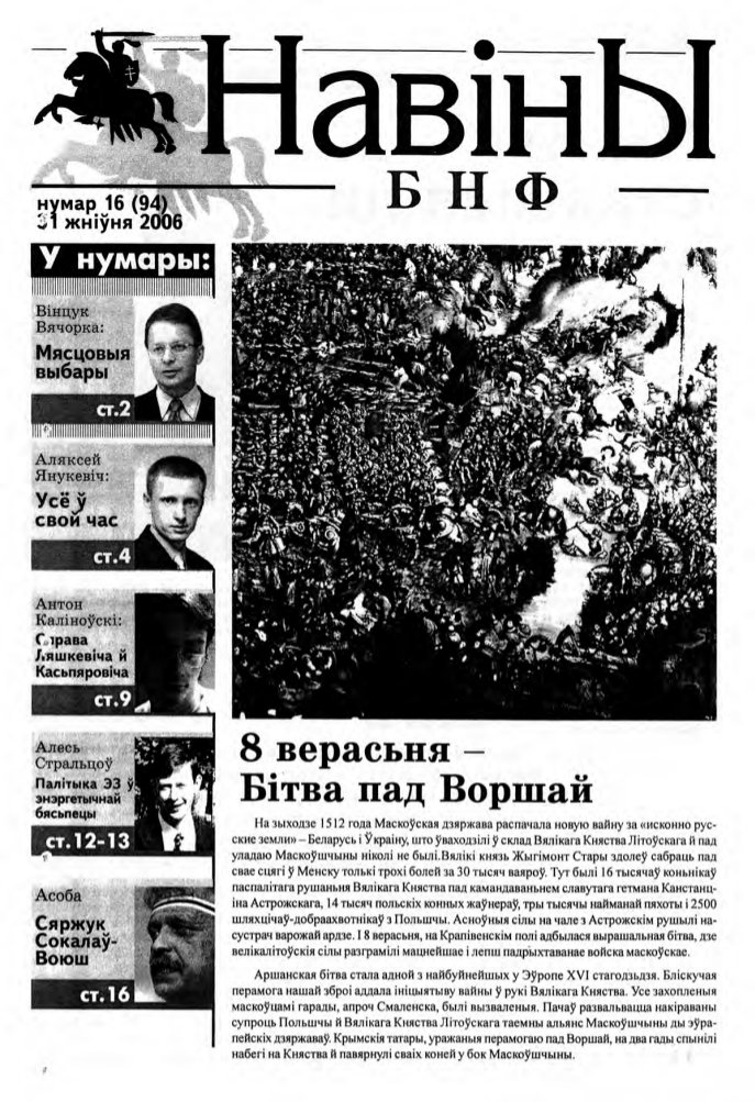 «Навіны БНФ - Распаўсюджваецца бясплатна на правох унутранай дакумэнтацыі. Галоўны рэдпктар: Юры Гембіцкі, выпускны рэдпктар: Франак Вячорка.