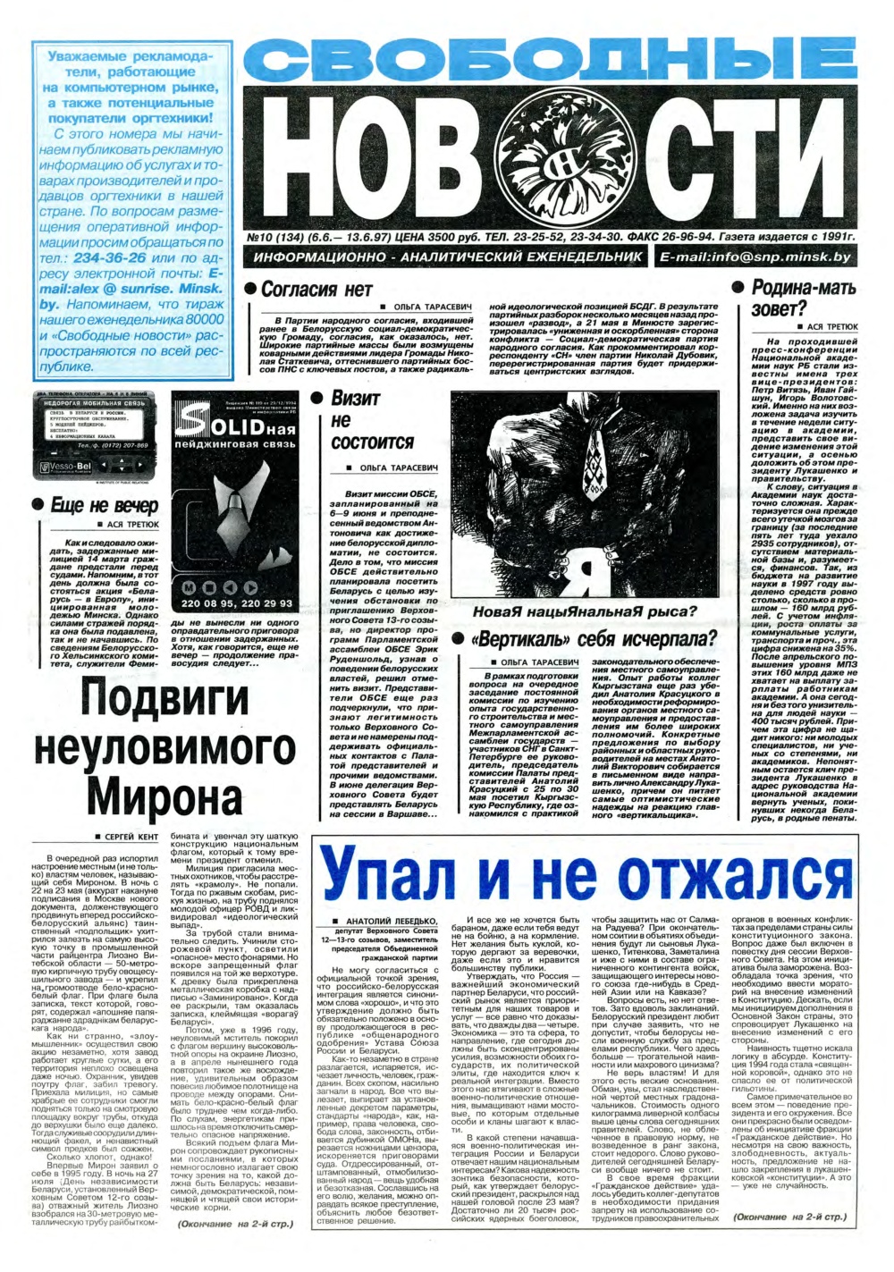 «Свободные новости плюс» — информационно-аналитический еженедельник. Издается с сентября 2002 года. Учредители: Белорусская научно-промышленная ассоциация и промышленно-коммерческая компания «Белфакс». За текст рекламы несет ответственность рекламодатель.