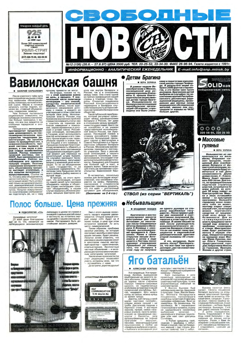 «Свободные новости плюс» — информационно-аналитический еженедельник. Издается с сентября 2002 года. Учредители: Белорусская научно-промышленная ассоциация и промышленно-коммерческая компания «Белфакс». За текст рекламы несет ответственность рекламодатель.