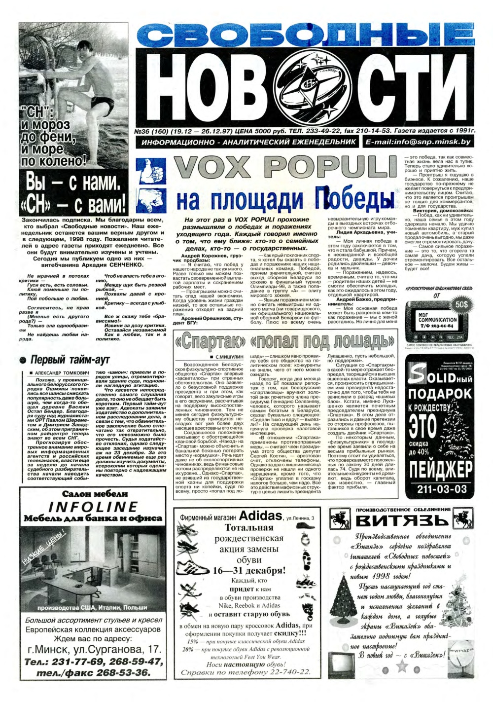 «Свободные новости плюс» — информационно-аналитический еженедельник. Издается с сентября 2002 года. Учредители: Белорусская научно-промышленная ассоциация и промышленно-коммерческая компания «Белфакс». За текст рекламы несет ответственность рекламодатель.