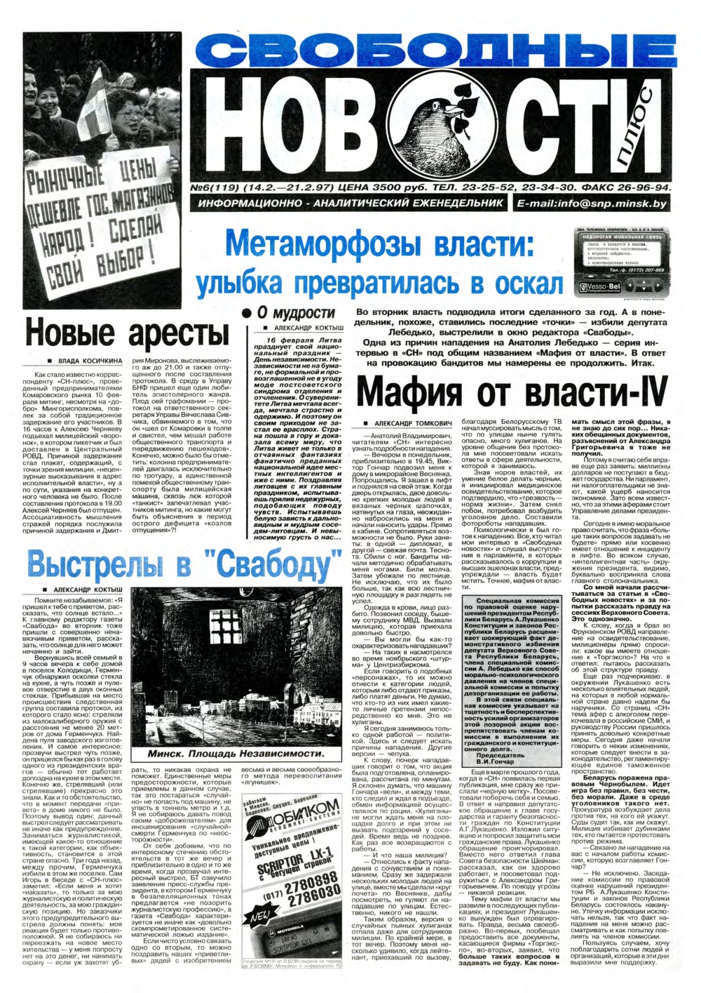 «Свободные новости плюс» — информационно-аналитический еженедельник. Издается с сентября 2002 года. Учредители: Белорусская научно-промышленная ассоциация и промышленно-коммерческая компания «Белфакс». За текст рекламы несет ответственность рекламодатель.