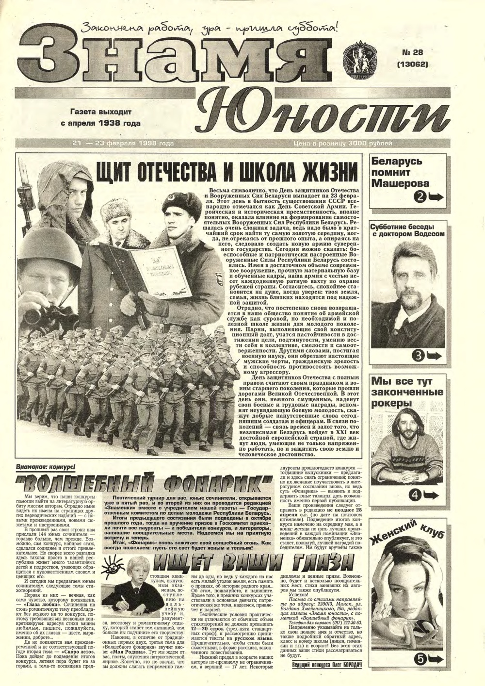 «Знамя юности» — общественно-политическая газета Белоруссии. Газета образована в 1938 году как совместный печатный орган Центрального комитета и Минского областного комитета ЛКСМ Белоруссии. Первый номер вышел 10 апреля 1938 года. Называлась газета «Сталинская молодёжь». Учредителем газеты с 1956 года являлся ЦК ЛКСМ Белоруссии. В годы Великой Отечественной войны газета выходила на одном из фронтов Красной Армии в виде листовки формата А4. Первый полноформатный послевоенный номер газеты «Сталинская молодёжь» вышел 6 июля 1945 года. В июне 1956 года газета «Сталинская молодёжь» переименована в газету «Знамя юности». Крыніца: ru.wikipedia.org