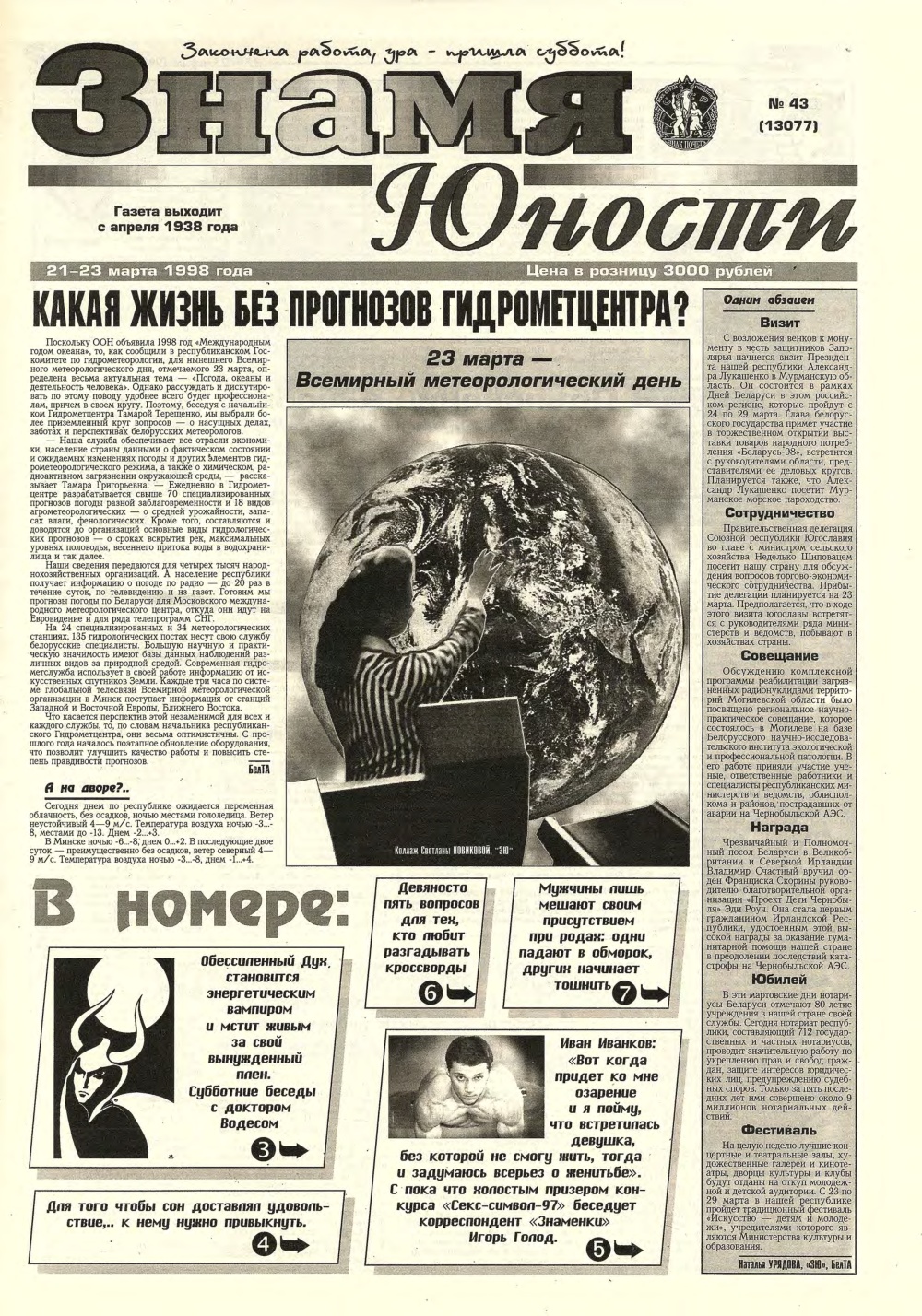 «Знамя юности» — общественно-политическая газета Белоруссии. Газета образована в 1938 году как совместный печатный орган Центрального комитета и Минского областного комитета ЛКСМ Белоруссии. Первый номер вышел 10 апреля 1938 года. Называлась газета «Сталинская молодёжь». Учредителем газеты с 1956 года являлся ЦК ЛКСМ Белоруссии. В годы Великой Отечественной войны газета выходила на одном из фронтов Красной Армии в виде листовки формата А4. Первый полноформатный послевоенный номер газеты «Сталинская молодёжь» вышел 6 июля 1945 года. В июне 1956 года газета «Сталинская молодёжь» переименована в газету «Знамя юности». Крыніца: ru.wikipedia.org