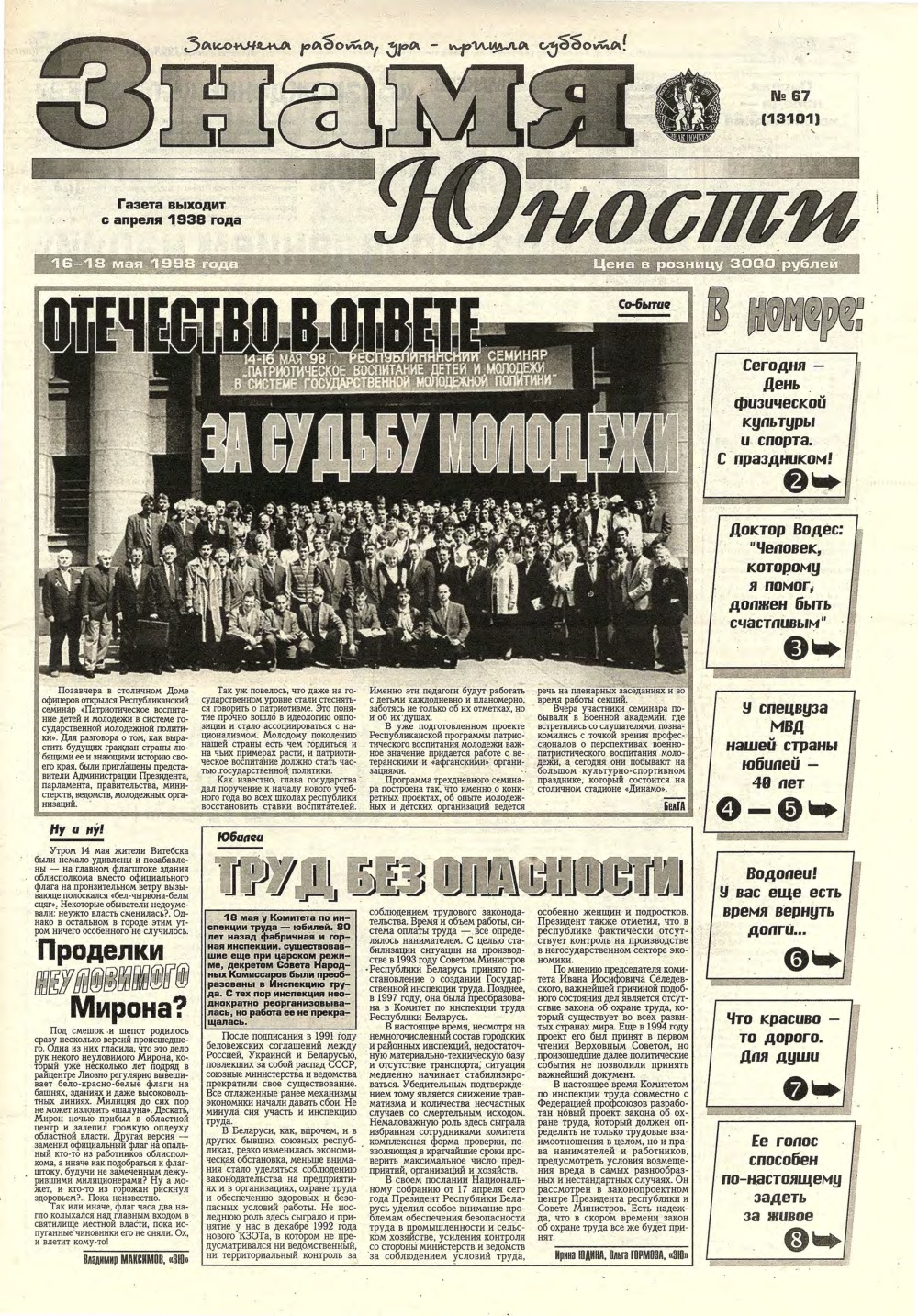 «Знамя юности» — общественно-политическая газета Белоруссии. Газета образована в 1938 году как совместный печатный орган Центрального комитета и Минского областного комитета ЛКСМ Белоруссии. Первый номер вышел 10 апреля 1938 года. Называлась газета «Сталинская молодёжь». Учредителем газеты с 1956 года являлся ЦК ЛКСМ Белоруссии. В годы Великой Отечественной войны газета выходила на одном из фронтов Красной Армии в виде листовки формата А4. Первый полноформатный послевоенный номер газеты «Сталинская молодёжь» вышел 6 июля 1945 года. В июне 1956 года газета «Сталинская молодёжь» переименована в газету «Знамя юности». Крыніца: ru.wikipedia.org